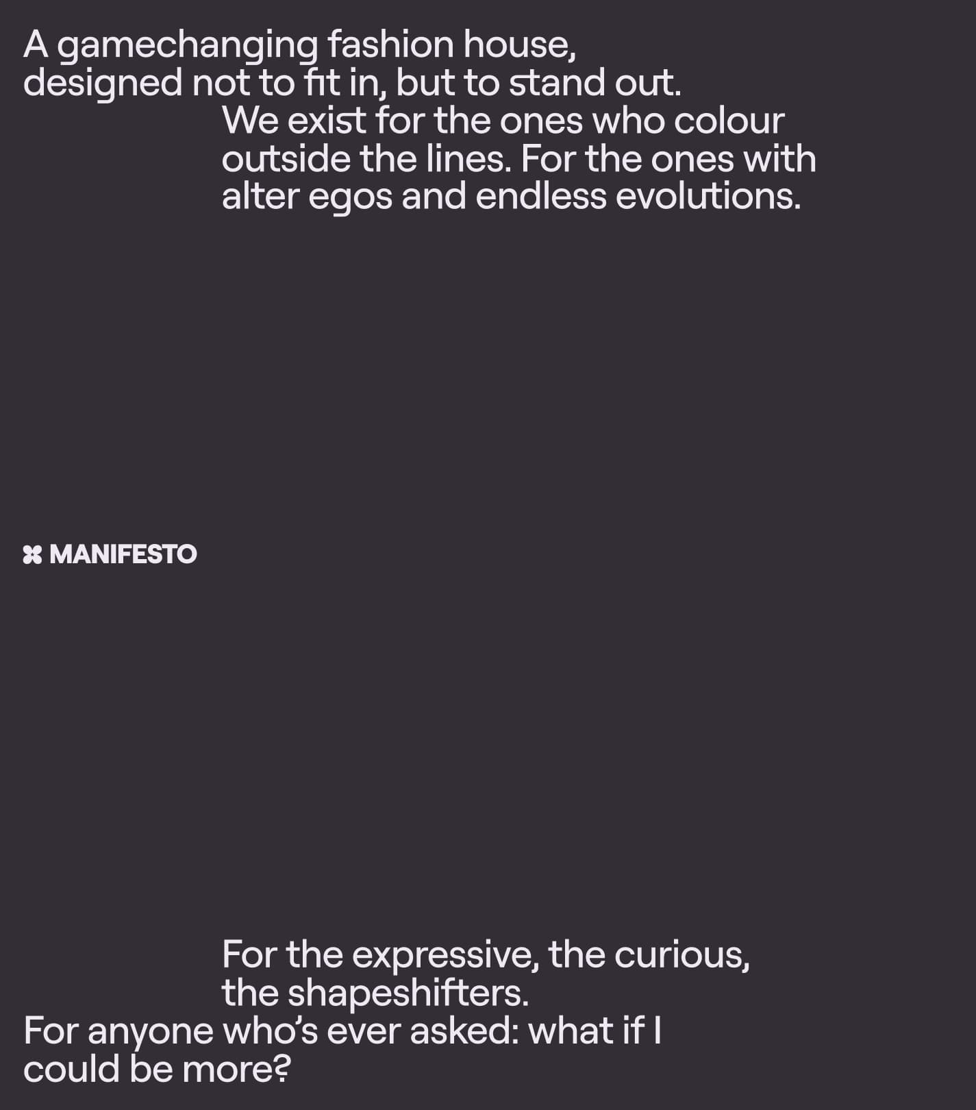 The strategy reframed Blueberry as a digital fashion house built around identity authorship. The insight was behavioural. Avatars create a space where identity can be rehearsed without social risk, allowing people to experiment with how they present themselves before carrying those expressions into the physical world. This moved digital fashion from novelty into a meaningful form of self-definition. The organising idea, Dare to Be, captured that permission. The brand rewards individuality and experimentation while resisting conformity and passive consumption.